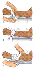 - aplicarea se face cu ambele mâini: se tine sulul de fasa în mâna dreapta, prins între police si cele patru degete, iar capatul initial se prinde cu mâna stânga);