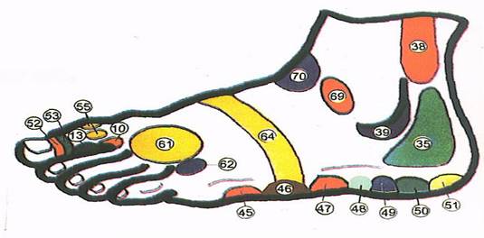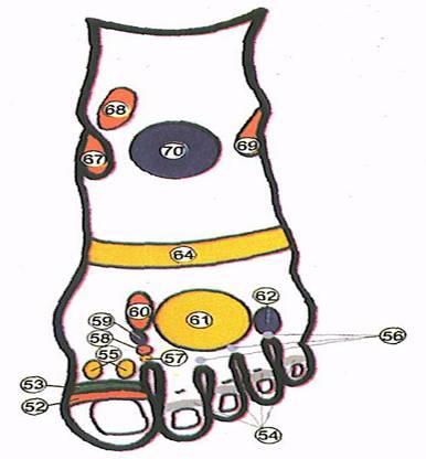 - organele, glandele situate pe cap, fata si creier, au proiectiile pe talpa inversate,datorita incrucisarii nervilor centrali ai celor doua emisfere cerebrale: vom masa deci punctele ochi. urechi, nas, etc. de pe partea dreapta a capului, pe degetul stang si organele din partea stanga a capului-pe degetul drept.