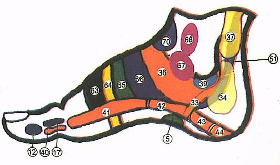 d) - organele perechi precum: rinichi, plamani, maini, picioare, etc. isi au proiectiile situate pe ambele talpi: partea stanga a perechii pe talpa stanga si partea dreapta a perechii organului pe talpa dreapta.