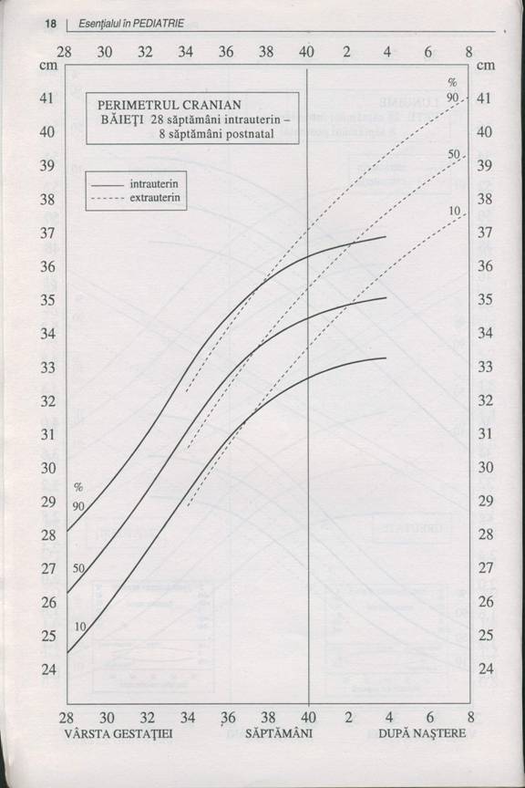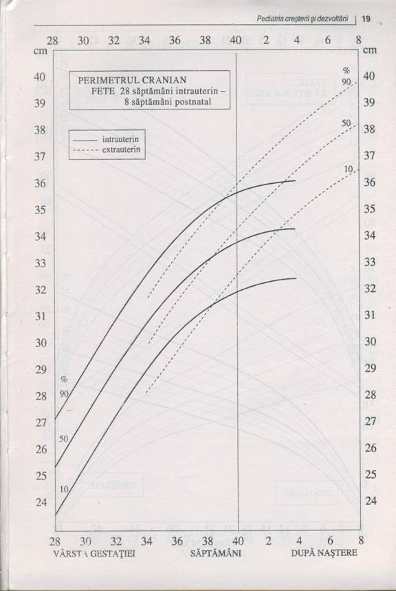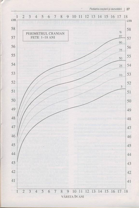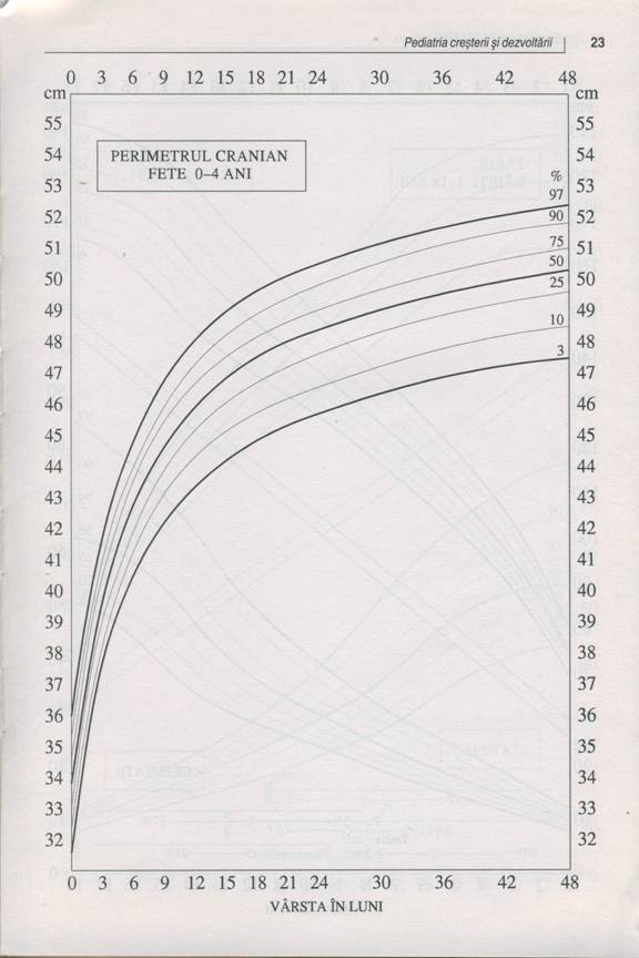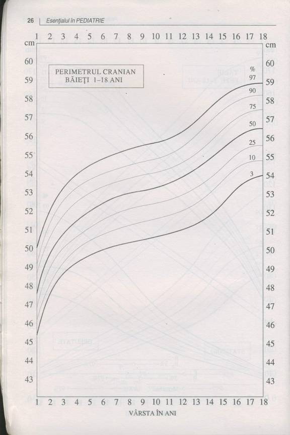 La nastere perimetrul cranian este de 34 cm, corespunzator percentilei 50. Perimetrul cranian creste în primul trimestru de viata cu 2 cm/luna, în trimestrul al doilea cu 1 cm/luna, iar în semestrul al doilea cu 0,5 cm/luna. La vârsta de 1 an perimetrul cranian are 45 cm, la 5 ani 50 cm, iar la 15 ani 55 cm.