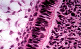 B. Intern (profund) cu celule inalte asezate pe o membrana bazala. Acest strat separa epiteliul de tesutul conjunctiv subiacent (= ECTOMEZENCHIM) . Acest ECTOMEZENCHIM e format din substanta gelatinoasa primitiva in care sunt dispersate celule fuziforme