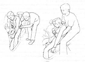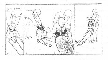 3. Cu accidentatul in pozitie sezanda (prin sprijin pe genunchii salvatorului) se plaseaza un antebrat de-a curmezisul abdomenului superior pe care salvatorul il prinde cu mainile trecute pe sub axilele acestuia, realizand o priza puternica (c).