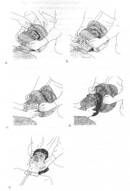3. Dupa indepartarea castii, capul este mentinut in usoara extensie de catre prima persoana pana la instituirea unui guler cervical de tip „minerva' (e).