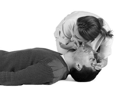 ridicarea barbiei si extensia capului vor fi mentinute tot timpul resuscitarii; se administreaza cele doua ventilatii timp in care compresiile toracice se intrerup; acestea se reiau imediat dupa a doua ventilatie, asteptand doar ca salvatorul sa indeparteze buzele de pe fata victimei;