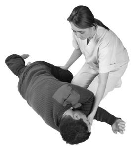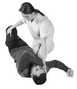 cu o mana pe genunchiul flectat si cu cealalta mentinand dosul mainii victimei pe obraz, se roteste victima spre salvator in pozitie laterala, pana cand piciorul flectat se sprijina pe sol; (fig. 15)