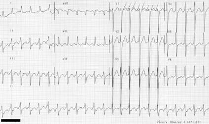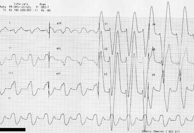 EKG - complexele ventriculare prezinta o morfologie intermediara între tahicardia si fibrilatia ventriculara.