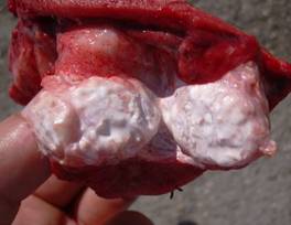 Macro: "cap de hipopotam" - maxilar si mandibula ingrosate, dintii sunt mobili in alveole, oasele se sectioneaza usor