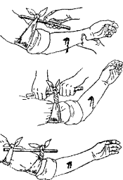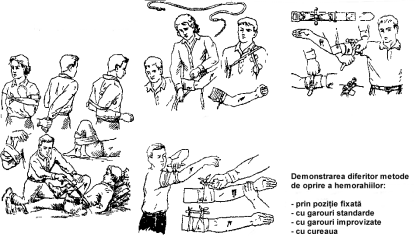 garoul intins se aplica mai sus de plaga, pe materialul aplicat, in asa mod ca primele 1-2 ture sa opreasca hemoragia
