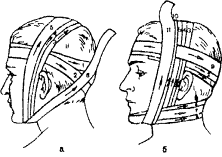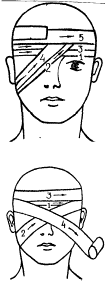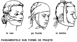 Ajungand pina la banda 1 de tifon, tensionat se face o tura in jurul ei si se indreapta tifonul 2 la regiunea opusa, pina cind se acopera uniform tot capul.Capatul fasiei se fixeaza de banda de tifon terminata, iar capetele tinute in jos, se leaga sub barbie. (vezi desenul)