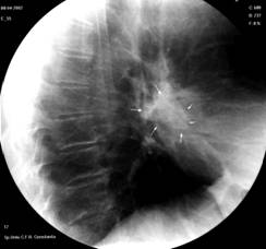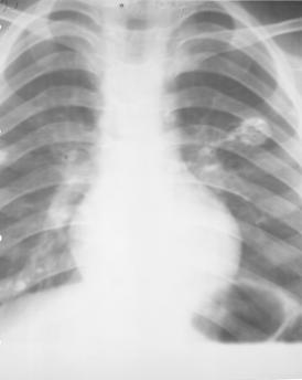 inchistarea mediastinala: in cazul localizarilor inalte (suprahilare) realizeaza o largire unilaterala a mediastinului cu limita externa rectilinie; in cazul localizarilor subhilare produce o opacitate triunghiulara sau in echer cu o latura pe conturul drept al cordului (la dreapta) si mascata partial de umbra cardiaca (la stanga);