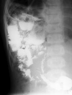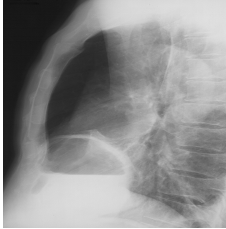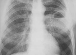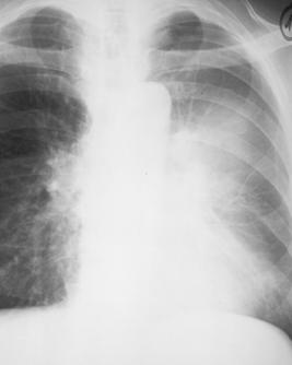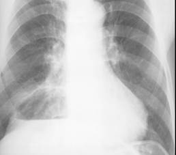 Fig. 26: Hernie traumatica de intestin subtire si colon prin ruptura de diafragm (opacitate intensa, neomogena, pe fondul careia apar o serie de transparente cu aspect de arcuri de cerc situata in baza dreapta: tranzitul baritat confirma diagnosticul) |