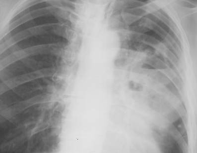 Apare la bolnavii tarati sau imunodepresivi, antrenand o opacitate intensa, sistematizata, limitata de scizura, cu convexitatea spre plamanul sanatos si evoluind catre necroza si abcedare in bronhii sau in pleura.