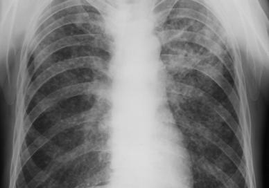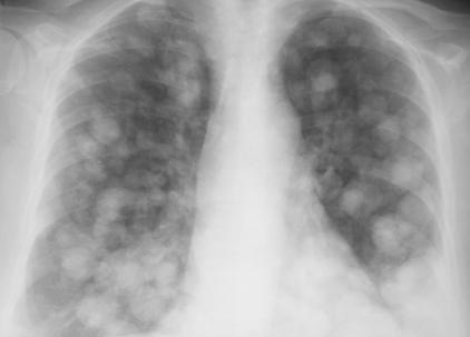 Radiologic apar imagini micro si macronodulare, diseminate sau grupate, evoluind catre constituirea de bule (hipertransparenta circumscrisa delimitata de un perete opac foarte fin, net conturat) si pneumatocele. Empiemul sau piopneumotoraxul pot de asemenea apare, prin fistule bronho-pleurale.
