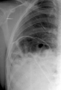Fig. 17 – Chist hidatic pulmonar drept rupt si partial evacuat (imagine hidroaerica cu contur subtire bine delimitat situata in lobul mijlociu drept) |