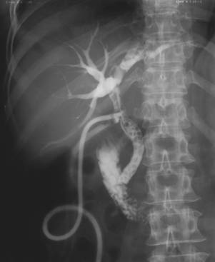 Fig. 56 – Calculi coledocieni reziduali (colangiografie pe tub Kerr – multiple imagini lacunare bine delimitate situate pe canalul coledoc) |
