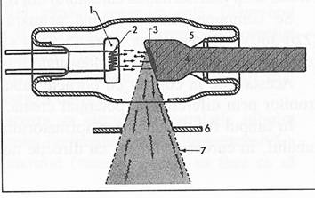 Fig. 1 - tubul radiogen: 1-catod, 2-filament, 3-focar termic, 4-anoda, 5- tbul cu vid in interior, 6- diafragme plumbate, 7-fasciculul de raze rezultat.