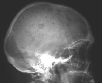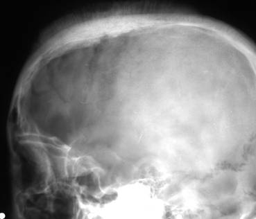 b) Tumora cu mieloplaxe – focar unic de osteoliza cu contur net, cu reactie scleroasa limitanta, situat de obicei occipital sau temporal.