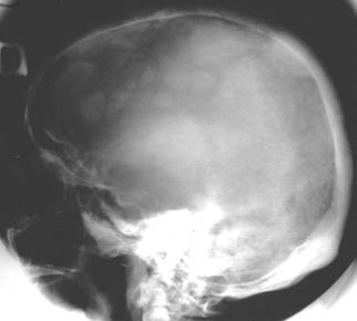 g) Craniostenozele – sunt realizate de inchiderea prematura a uneia sau mai multor suturi craniene, cu repercursiuni asupra formei craniului si, implicit, asupra dezvoltarii SNC. Radiologic se constata sporirea densitatii osoase la nivelul suturii in cauza, cu individualizarea dificila a elementelor componente si chiar absenta suturii; deformarea craniului se evidentiaza deasemenea si eventual semne de hipertensiune intracraniana.