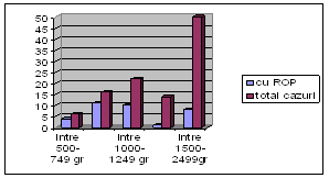 Greutate la nastere :500gr.-749gr.6 cazuri;750gr.-999gr.16 cazuri ; 1000gr.-1249gr.22 cazuri; 1250gr. - 1499gr.14 cazuri ; 1500gr. - 2499gr. - 50 cazuri ; peste 2500gr. - 2 cazuri