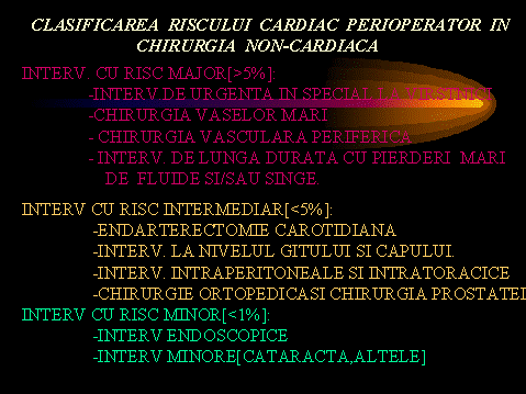 Dupa evaluarea clinica, paraclinica ,dupa efectuarea stratificarii riscului fiecarui pacient se obs ca practic interventia chirurgicala in functie de riscul cardiovascular si cel al interventiei va fi CI atunci cind se asociaza risc intermdiar cu risc mare , sau numai risc mare,