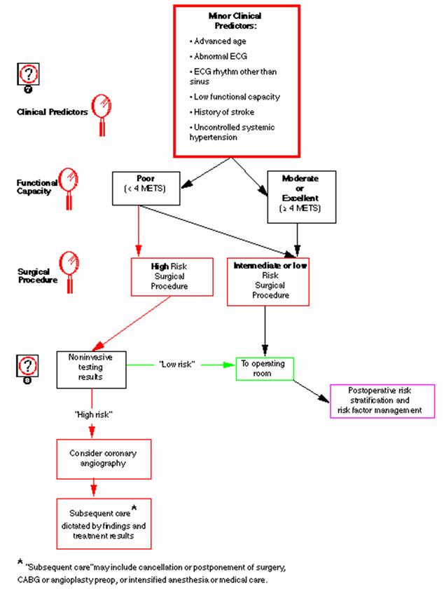 Astfel asocierea unei capacitati functionale proaste si a unor fact de risc chirurgicali mari se vor efectua teste noninvazive cardiace care daca arata un risc minim ne da dreptul ca efectuam interv chirurgica. Iar daca arata risc mare tb sa indrumam pacientul pt efectuarea unei coronarografii in functie de care se va lua decizia adecvata.