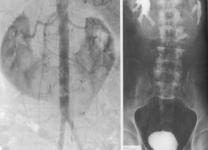 Pe radiografia renala simpla umbra renala este micsorata relativ, cu sau fara modificari de contur. Sistemul pielo-calicial se poate releva doar prin ecografie, CT sau pielografie ascendenta. Arteriografia renala prezinta o artera renala de calibru usor redus, artere intraparenchimatoase gracile, dislocate, arciforme. Nefrograma este mult întârziata, de intensitate slaba.