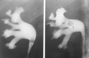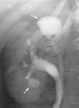 2. Staza urinara intermitenta o întâlnim în stenozele congenitale ale jonctiunii pielo-ureterale, ptoza renala, vase accesorii sau aberante compresive pe ureter (artere renale polare inferioare). De regula, puseele obstrucrive se instaleaza dupa un aport hidric excesiv, urmat de diureza crescuta. Se recomanda efectuarea aortografiei si a arteriografiei renale, urografiei dupa cresterea diurezei, efectuate în clino- si în ortostatism. Modificarile radiologice sunt similare celor din staza urinara acuta sau cronica (vezi în continuare).