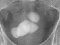 Calculii micsti pot fi stratificati, constituiti din inele radiotransparente si radioopace sau pot avea centrul radiotransparent si periferia radioopaca.
