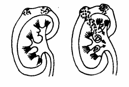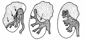 În evolutie, apar leziuni parenchimatoase localizate, care se vindeca vicios prin cicatrice sclero-retractile. Ele debuteaza în regiunile polare ale rinichilor, prin necroze papilare circumscrise, care capteaza substanta de contrast. Corticala renala, initial indemna, se îngusteaza treptat în dreptul calicelui bolnav, iar cicatrizarea produce o depresiune a conturului renal, datorita retractiei capsulare. Indexul parenchimatos se reduce treptat, uneori chiar pâna la 0.