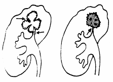 CANCERUL RENAL PROPRIU-ZIS produc boselarea localizata a conturului renal, uneori cu aspect neregulat, anfractuos. Tumorile mai mari, prezinta deseori calcificari amorfe, grosiere, neregulate, care se vad chiar la radiografia renala simpla. Examenul urografic va arata dislocari si compresiuni ale tijelor caliciale si calicelor, amprentari bazinetale. Tumorile ce se dezvolta medio-renal produc îndepartarea grupelor caliciale între ele - "semnul ghearei". Cancerul polului renal inferior determina o împingere mediana, spre coloana lombara a ureterului proximal.