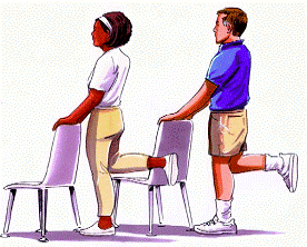 Tineti un scaun cu ambele maini, plasati piciorul drept in fata celui stang, apoi indoiti genunchiul drept pastrand genunchiul stang intins. Coborati coapsele spre podea, continuand sa mentineti flexia usoara a genunchiului drept (ca o fandare). Mentineti tot timpul spatele drept si talpile picioarelor lipite de podea pe cat posibil. Se mentine pozitia 20-30 secunde dupa care se repeta pe partea cealalta.