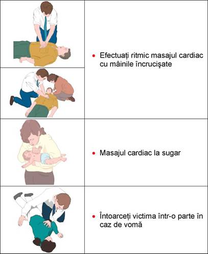 Daca apare voma în timpul resuscitarii întoarceti victima pe o parte, curatati gura victimei si continuati resuscitarea