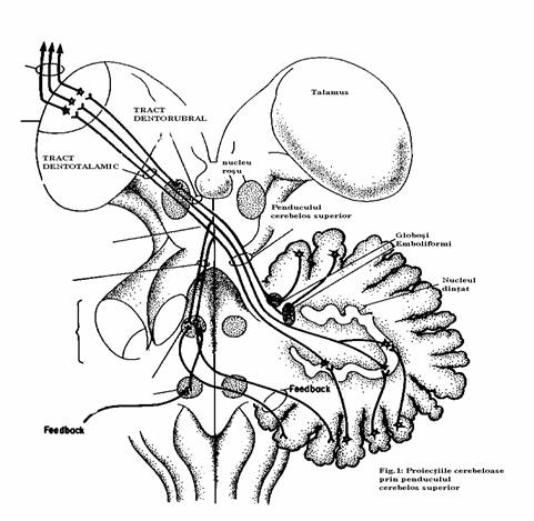c. Cel mai important circuit cerebelos conecteaza cerebelul cu cortexul motor cerebral, iar prin fasciculul piramidal cu neuronul motor periferic formand circuitul cerebrocortico-ponto-cerebelocortico-dentato-talamo-cortico-piramido-motoneuron periferic.