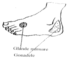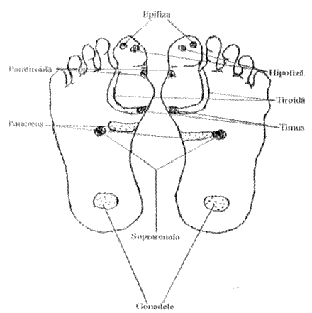 Punctul reflex al acestei glande este chiar mai mic decat cel al hipofizei si este situat la cca 1 cm alaturi de punctul reflex al hipofizei, spre partea interioara a halucelor, pe fetele posterioare.