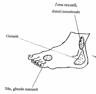 Puncte reflexogene. Sunt situate in mijlocul calcaielor ambelor talpi si pe partile laterale ale labelor picioarelor, intre maleolele externe si tendonul lui Ahile. Punctul reflex din mijlocul calcaiului stimuleaza functia endocrina, pe cand punctul situat pe partile laterale, stimuleaza functia exocrina.