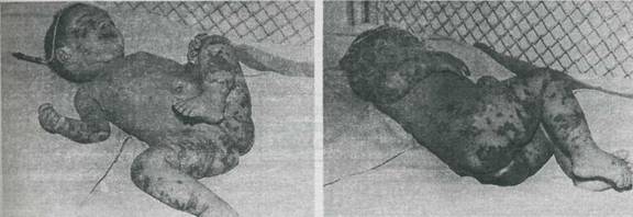 Fig. 9-31. Purpura fulminans īntr-o septicemie menigococica (sindrom Waterhouse-Friederichsen). Purpura necrotica extensiva care progreseaza "īn pata de ulei" pe membre si pe fata.