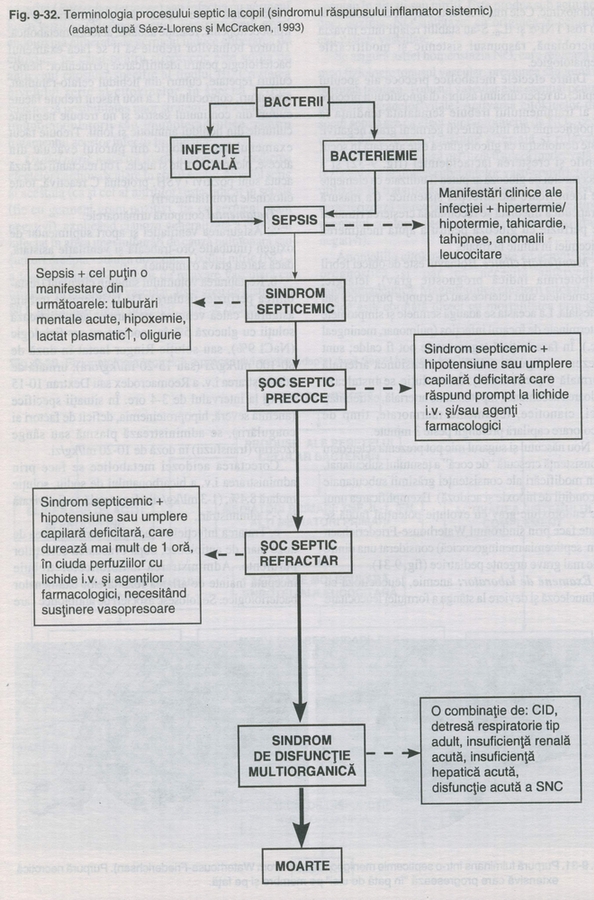 Schema 9.30 prezinta fiziopatologia ipotetica a socului septic, demonstrabila la orice vārsta. Particularitatile tin de etiologie si deficitul de aparare imuna a organismului gazda.