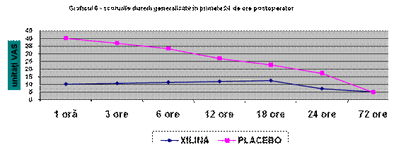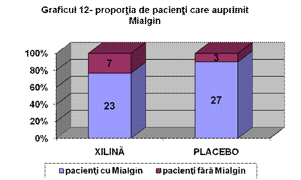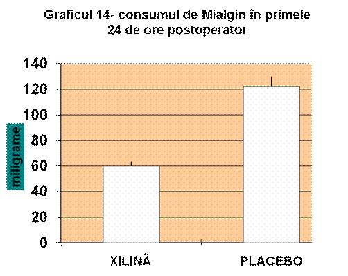 Consumul mediu de analgetic opioid în primele 24 de ore postoperator a fost semnificativ crescut în grupul PLACEBO, si intervalul trezire din anestezie - prima administrare de Mialgin a fost semnificativ mai mre mai mare în grupul XILINĂ.