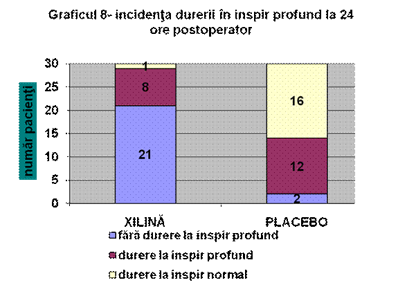 De înalta semnificatie statistica (p < 0,001) este lipsa durerii în inspir profund la 72 % din pacientii din grupul XILINĂ, fata de numai 8% din grupul PLACEBO la 24 de ore postoperator.