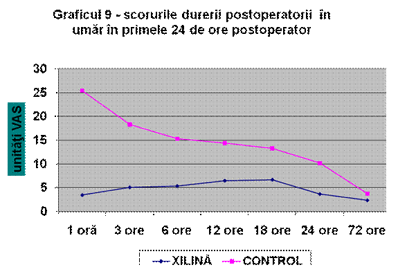Intensitatea durerii în umar a fost semnificativ (p < 0,05 ) mai redusa la grupul XILINĂ la toate intervalele postoperatorii din primele 24 de ore. La 72 de ore, aceasta a fost egala în cele 2 grupuri.