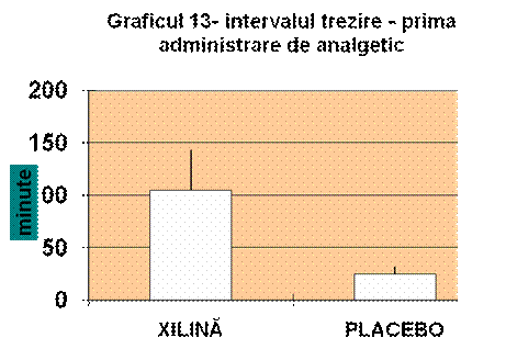 Timpul mediu de la trezirea din anetsezie dupa care pacientul a cerut prima data analgetic a fost semnificantiv (p<0,05) mai lung la pcientii din grupul XILINĂ.