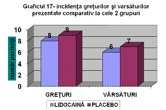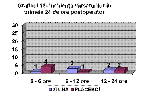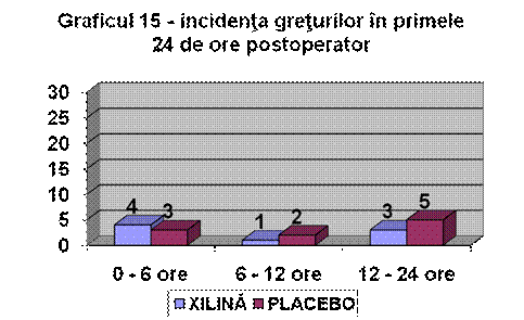 Nu exista diferente semnificative statistic între cele 2 grupuri în privinta incidentei totale a greturilor si varsaturilor în primele 24 de ore postoperator.