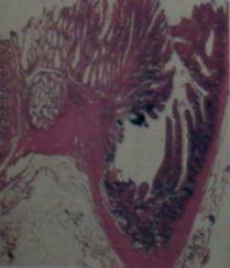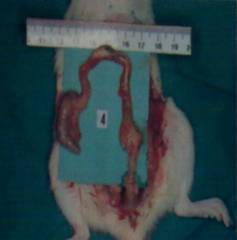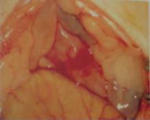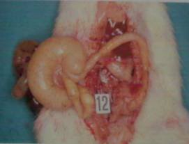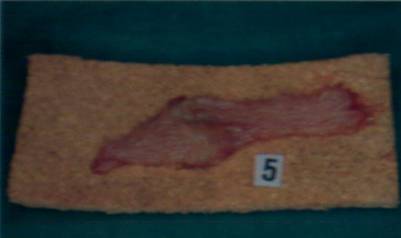 Animalele au fost sacrificate dupa 6 saptamâni (la sfârsitul fazei de maturatie), prin supradoza cu eter, zona anastomozei fiind decupata si conservata în formol 10% pentru examenul histologic, efectuat în toate cazurile de catre acelasi histo-patolog (vezi fig. 5).