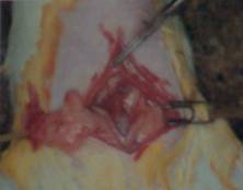 Laparotomia, prin incizie mediana posterioara s-a realizat respectând regulile de asepsie. Prin retractie, s-a obtinut o buna expunere a organelor abdominale, umezindu-se repetat cavitatea peritoneala cu solutie CIN la 0,9% (în total între 3-5 ml) (vezi Fig. 1).