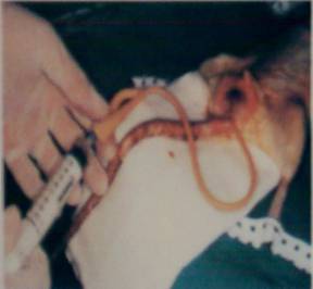 Acelasi lucru s-a petrecut în cazul explorarii abdominale efectuate în timpul examenului necropsic, care a s-a încheiat prin integritatea si cicatrizarea colotomiei, fara nici o urma de deschidere anastomotica (vezi fig. 6).
