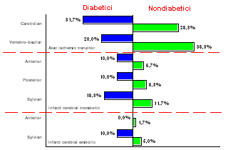 Mai mult , daca vom compara afectarea preocluziva si ocluziva a arterei carotide interne în cadrul lotului III cu celelalte doua loturi observam ca în grupul diabeticilor fara accident vascular cerebral procentul acestei afectari este de 8,4%, fata de 25% lotul I si 15% lotul II. Concluzia ar fi ca si diabeticii lotului doi pot prezenta stenoze serioase la nivel carotidian intern, chiar daca sunt minim manifeste clinic, mai ales în stare de repaus, dar nu într-un procent atât de mare care sa duca la producerea unui AVC. Comparând lotul nondiabeticilor cu AVC cu lotul III , din acest punct de vedere este normal ca balanta sa fie în favoarea lor. Popa (2) Sustine ca AIT apare de trei ori mai mult la pacientii diabetici noninsulinodependenti dar asocierea AVC cu lezarea carotidei extracraniene nu este evidenta, studiul efectuat determinând o stenoza carotidiana mai mare de 50% la 8,2% dintre pacientii diabetici fata de 0,7% la subiectii de aceeasi vârsta si sex.