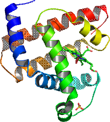 Mioglobina este o hemoproteina monomera, cu structura asemanatoare unei subunitati de hemoglobina , fiind alcatuita dintr-un lant proteic elicoidal care contine in interiorul sau o grupare prosteica ,hemul (fig.1) . In mioglobina ionul de fier (II) are numarul de coordinare cinci deoarece se leaga coordinativ de patru atomi de azot ai inelelor pirolice din hem si de un azot de histidina din proteina. Mioglobina are rolul de depozitare a oxigenului si este prezenta in tesutul muscular. Aceasta este prezenta in tesutul muscular, cu o greutate moleculara de 17000 alcatuita dintr-un nucleu heminic si un lant polipeptidic format din 153 resturi de aminoacizi, numit si lant m; lantul polipeptidic are un grad de ordonare mare.