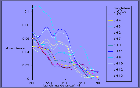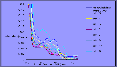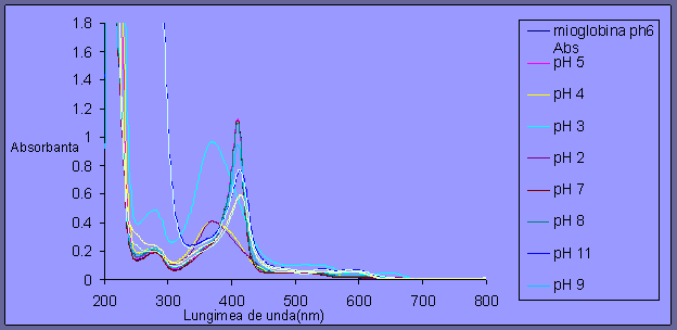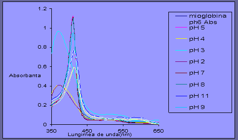 Din spectrul UV-Vis al mioglobinei la diverse valori de pH se observa ca mioglobina da nastere spectrelor (formata din aminoacizi si Fe in mijlocul porfirinei). Putem observa de asemenea ca pH-ul influenteaza schimbarea concentratiei protonilor iar aminoacizii sunt in contact cu protonii care dau pH-ul. In proteina aminoacizii se orienteaza in jurul hemului, fortele fiind legaturi de hidrogen, Van Der Waals si puntii ionice care implica protoni, atfel aceste legaturi sunt influentate de schimbul de pH. Daca concentratia de protoni este foarte mare ,proteina se v-a denatura (nu mai este impachetata in jurul hemului). Semnul denaturarii proteinei este evidentiata prin banda Soret care este largita, pe cand, in mod normal banda Soret este foarte definita.