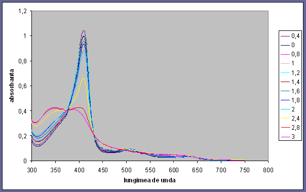 In cazul probelor la pH=7, odata cu reducerea metalului am observat o depalsarea a benzii Soret spre vizibil pentru Fe in forma ferica la lungimea de unda de 409 nm, respectiv in cazul formei feroase la 435 nm, precum si o scadere in intensitate a acesteia;