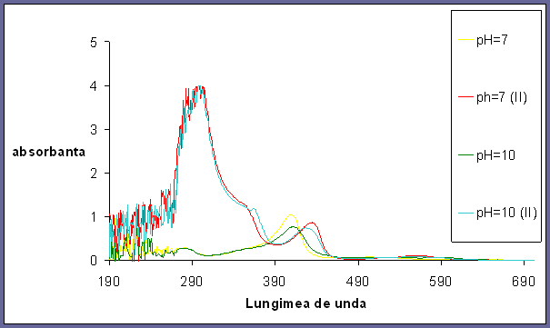 La lungimea de unda 450 bazicitatea este reprezentata sus si aciditatea jos. Se mai poate spune ca in intervalul 480 - 520 nm unde pentru pH 10, pH 11, pH 12, pH 13 curba U este aceeasi iar de la pH 2 pana la pH 9 curba este invers.